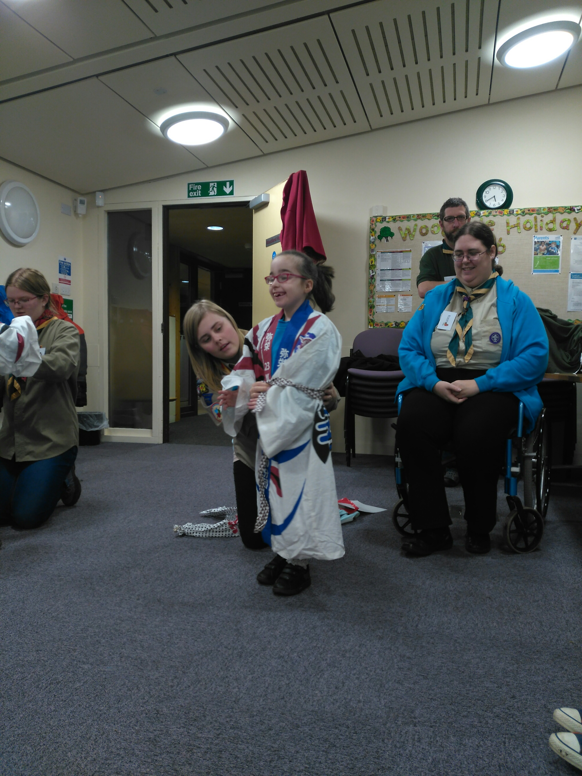 Trying on Japanese clothing. Rachel went to Japan for a Scout Jamboree!