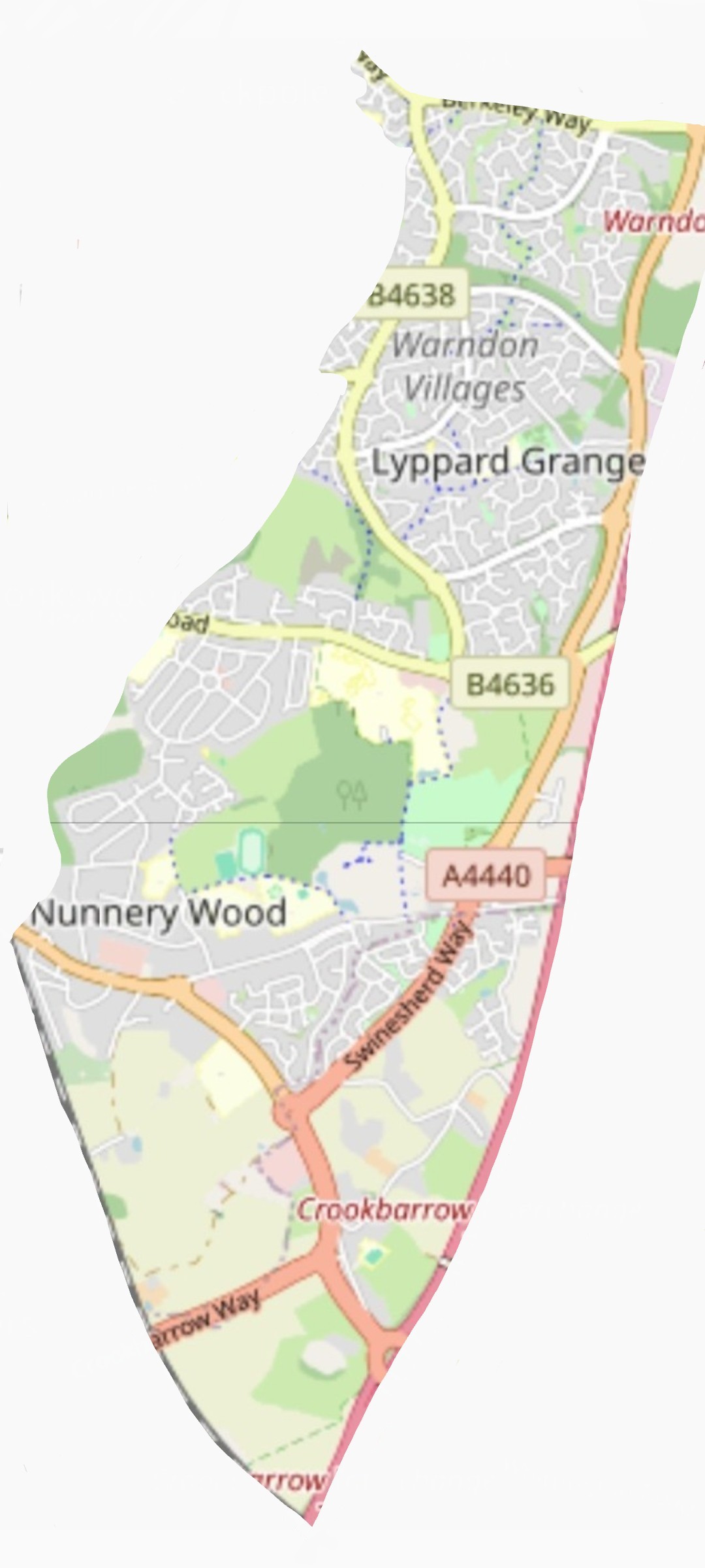 Warndon Villages, Nunnery Wood, Whittington, Ronkswood (east of Ronkswood and Perry Wood Nature Reserves) and a small area of Redhill (between the railway and London Road).